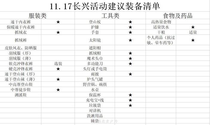 11月17日6:45滨湖区梁清路600号华润万家肯德基门口(梁清路隐秀路口)集合,导航“华润万家(滨湖店)”,领队:小妮13812500495,清水13914116607。请带好身份证参加,全程对号入座,定点上下车,中途不停车。请穿着适合户外活动的服装,雨具、带好遮阳帽子、等装备,穿着徒步鞋或运动鞋参加,请勿穿着其他不适合户外活动的鞋类(不听从劝告引发事故,后果自负)。户外活动不要佩戴首饰,以免丢失。
