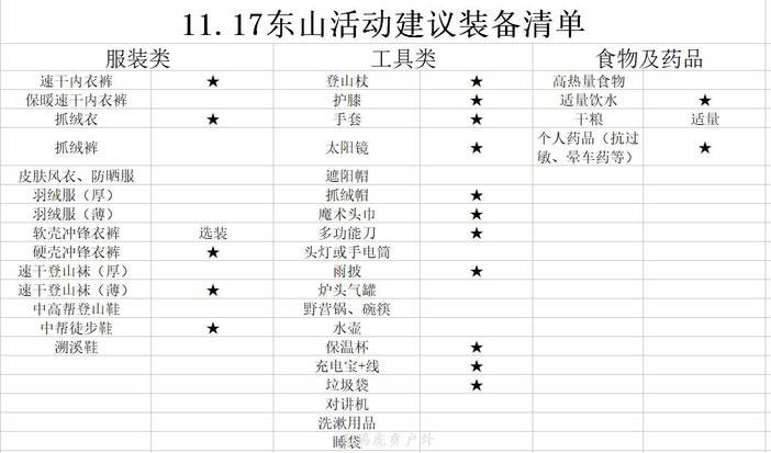 11月17日6:45滨湖区梁清路600号华润万家肯德基门口(梁清路隐秀路口)集合,导航“华润万家(滨湖店)”,领队:村长15312214332,请带好身份证参加,全程对号入座,定点上下车,中途不停车。请穿着适合户外活动的服装,雨具、带好遮阳帽子、等装备,穿着徒步鞋或运动鞋参加,请勿穿着其他不适合户外活动的鞋类(不听从劝告引发事故,后果自负)。户外活动不要佩戴首饰,以免丢失。