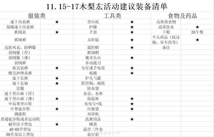 11月15日18:00火车站中旅大酒店背后河边集合,18:30滨湖区梁清路600号华润万家(滨湖店)肯德基门口(梁清路隐秀路口)集合,领队:芹儿18651515536,石榴18012475250。请带好身份证参加。每个上车点等候5分钟,迟到视为自动退出,费用不退。全程对号入座,定点上下车,中途不停车。请穿着适合户外活动的服装、带好护膝、登山杖、雨具、遮阳帽子等装备,请穿着中帮徒步鞋参加活动。山顶住宿比较简陋,多人间公卫,水源紧张的时候不能洗澡,请大家有思想准备。目前是森林防火期,山顶建筑多为木质,请勿吸烟。有晕车晕船历史的,请自备药品。户外活动不要佩戴首饰,以免丢失。请按装备推荐认真准备。