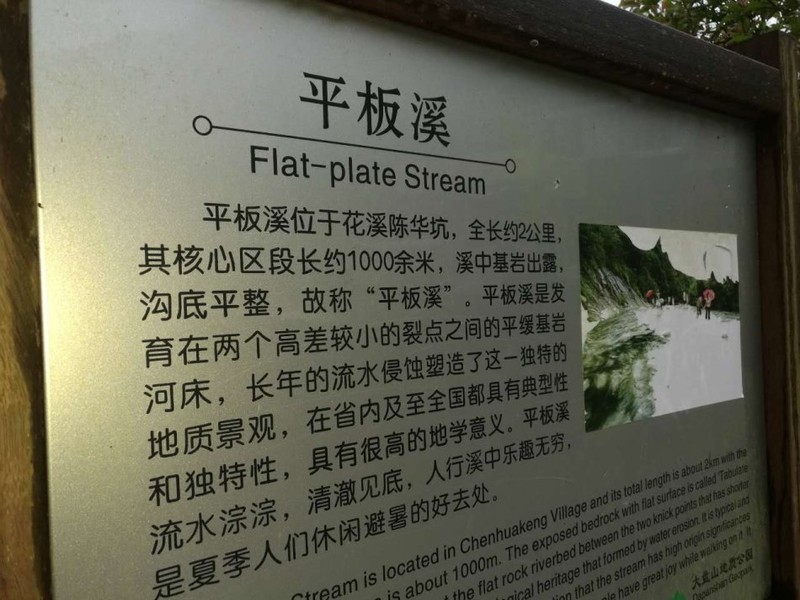 平板溪总长逾3000米,裸露部分长1080米,整条溪底平整如削,无沙土积岩,溪中可滑冰、骑车。平板溪上流水淙淙,清澈见底,人赤足走在平板溪上,河床轻抚脚底,小鱼在趾间穿梭,这无疑是一处绝美的天然足浴场!如在炎炎夏日,涉平板溪流,戏花溪水一定是妙不可言、乐趣无究。难怪米芾要说“此地风光三吴无,平砥清流世间殊”,并题下了“天下一绝”四个大字,也许当年他也曾在平板溪上“老夫聊发少年狂”吧。