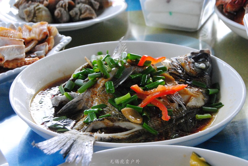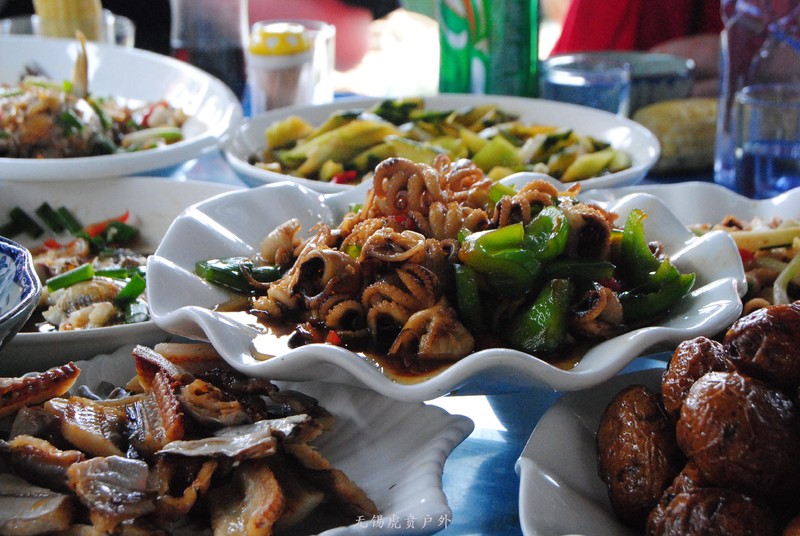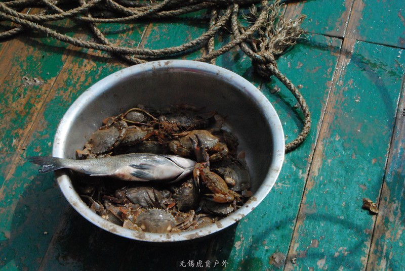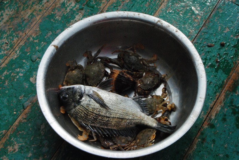 这就是捕到的鱼,船家烧菜红绿搭配挺好。挺多的,小孩不吃,只能我们努力吃,把小孩身上损失的,我们来补上。。。
