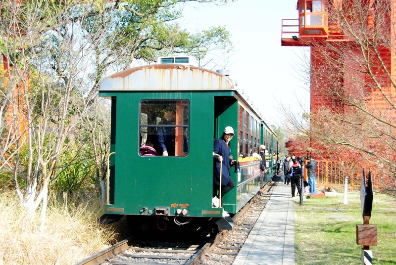 这里就能看到绿皮小火车了,有小火车在,就有工作人员来维护秩序了,不让人到铁轨上。