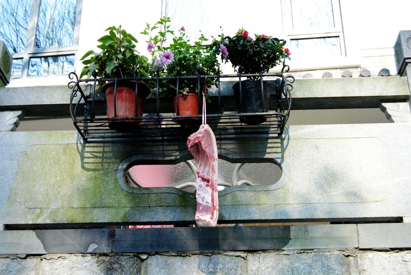 我们经过这家的时候,发现这花架下面吊了一块肉,一群人都杂七杂八讨论起了这块肉:这块肉从何而来;为何会挂在这里;这肉腌了么等等,我倒觉得,花是雅的,肉是俗的,挂一起,形象得展示了“大俗就是大雅”这句至理名言。