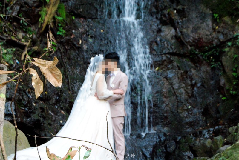 这边有瀑布,正好有对新人在小瀑布前拍婚纱照。
