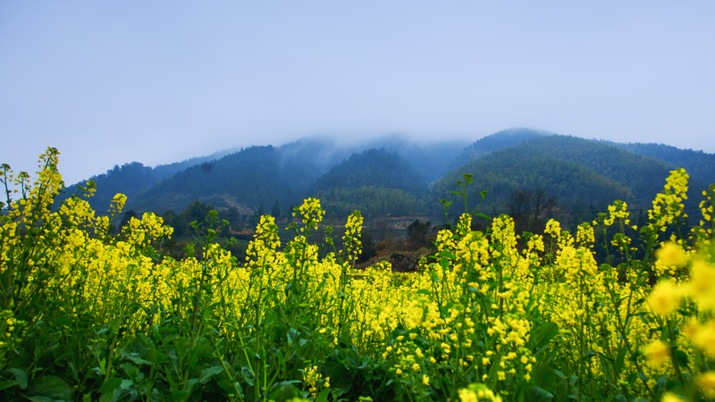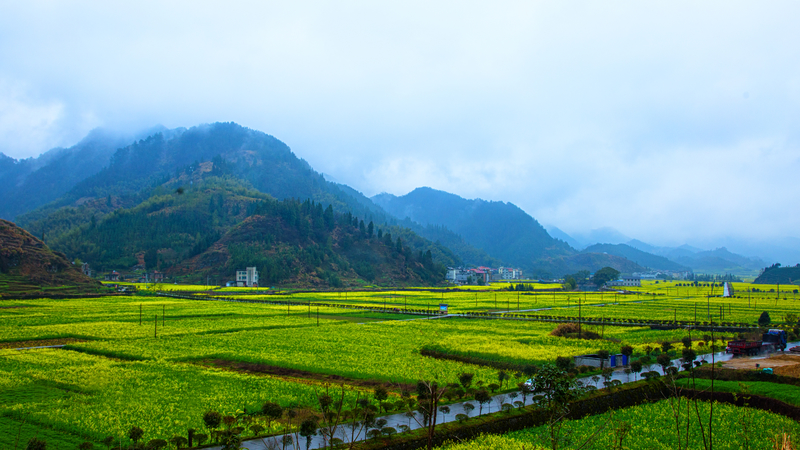 走在乡间地头, 濛濛细雨伴着薄雾罩在一片金黄的田野上,轻盈的菜花沾着雨珠,分外碧绿金黄,生机勃勃。