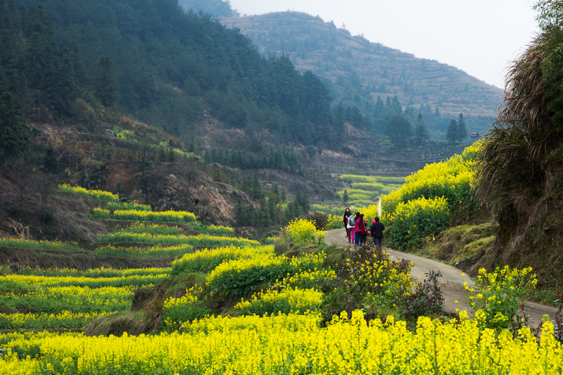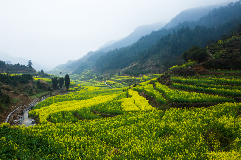 走入田野,满眼金黄,层层梯田里开满了金灿灿的油菜花,站在山脚眺望,远处山头上云雾袅绕,如同仙境