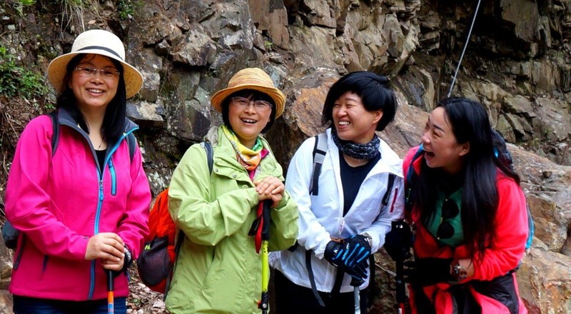 到第一个休息点,有个小伙伴可能走的太快,心跳加速,整个人都感觉不好了。领队末末一路陪她,歇歇走走。