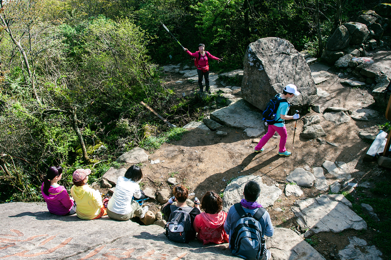 顺着吴越古道石板路台阶而上,一路溪流陪伴,瀑布奏鸣,曲径通幽,似在画中游。约2—3个小时到达千倾关,千顷关为两块巨大而光滑的花岗岩构成,像门一样挡在眼前,这一处天然石门,高近4米,厚约3米,宽可两人并行,其势“一夫当关,万夫莫开”。