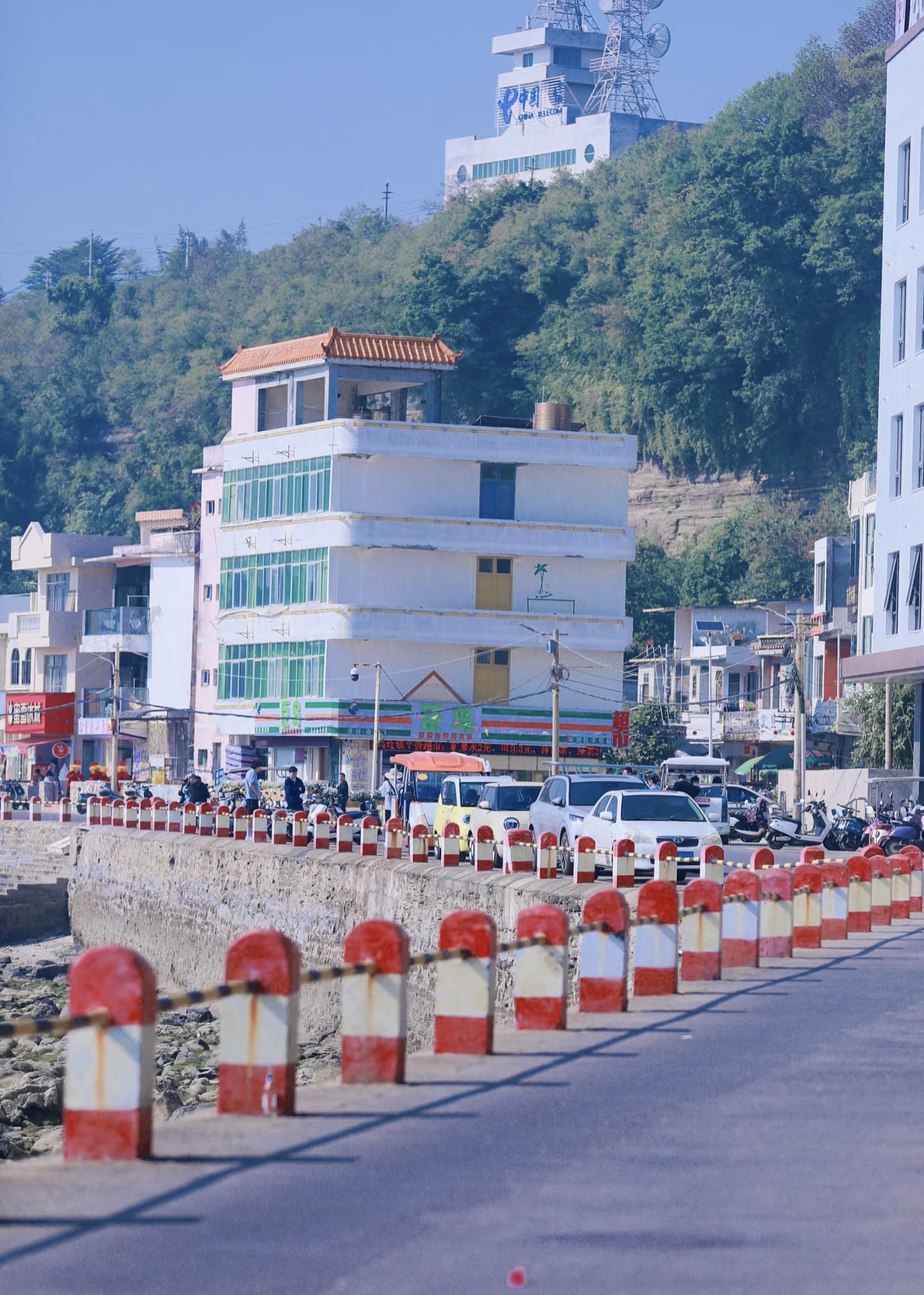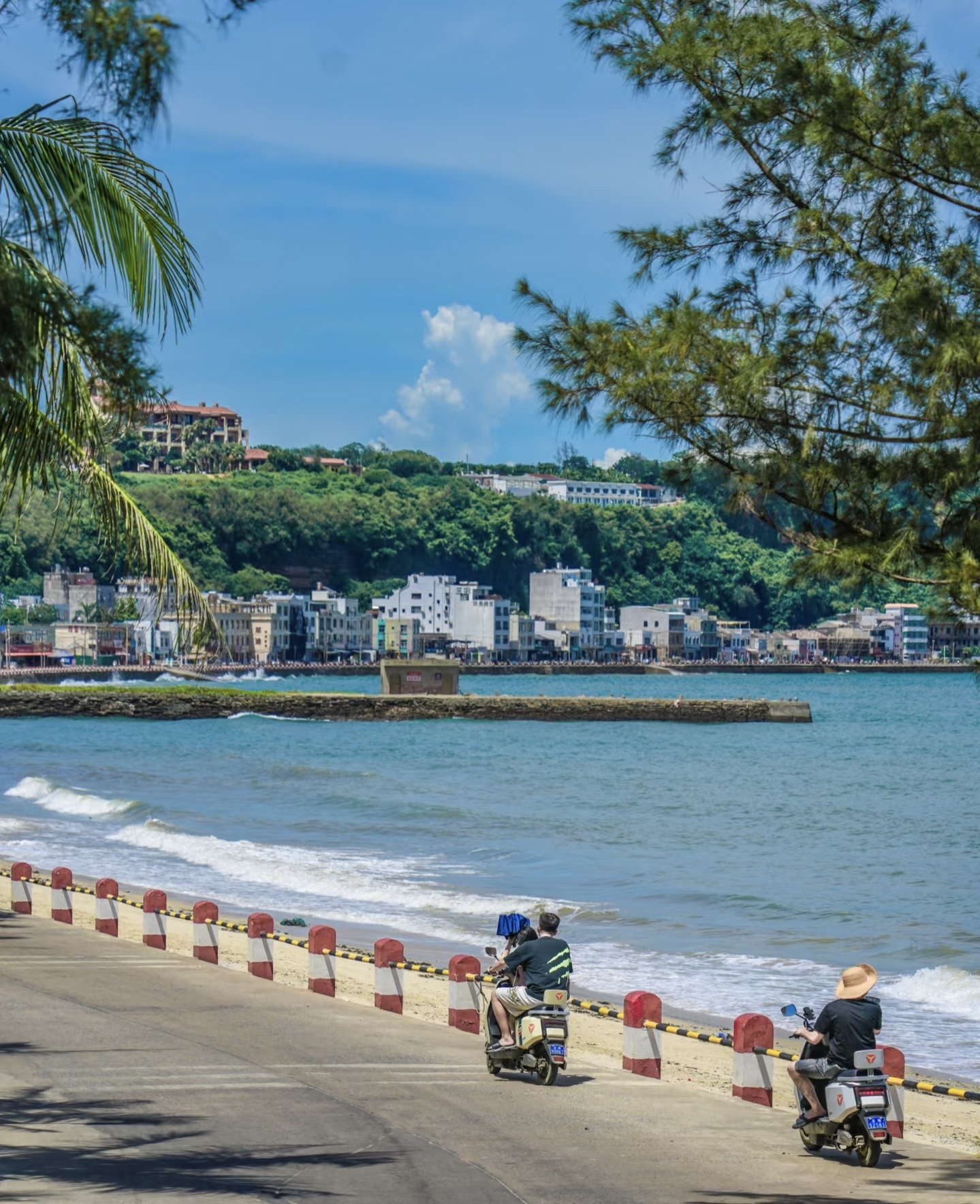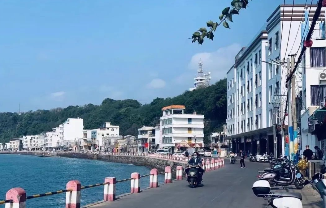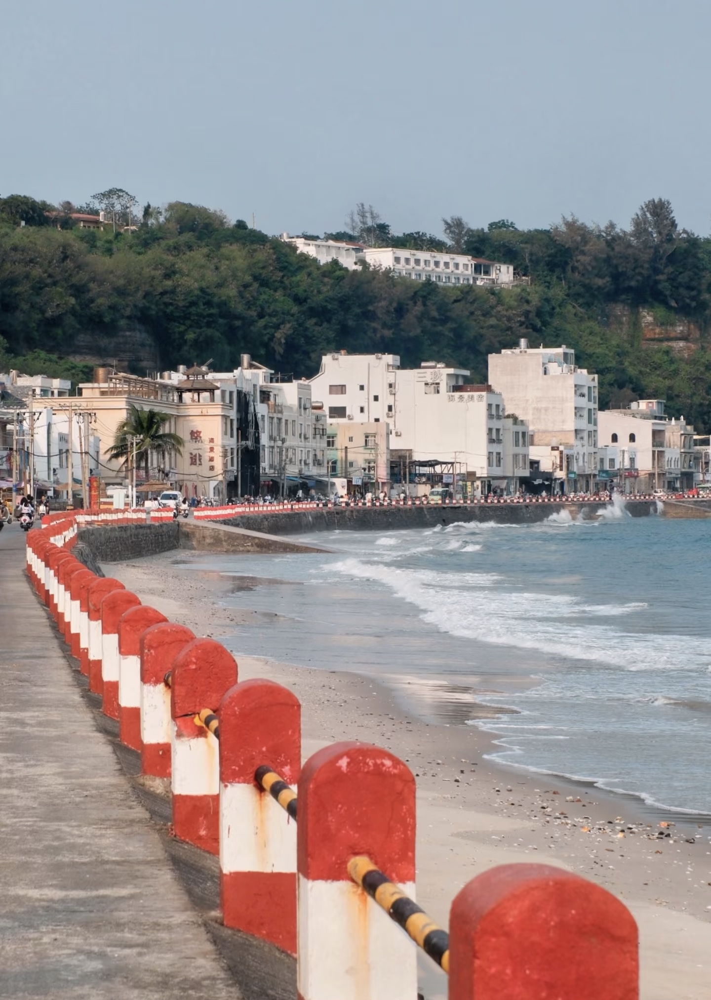 南湾街,建筑多为骑楼建筑,它是岭南传统建筑风格与西欧罗马式建筑风格融合的产物。这里有岛上最大的海鲜市场,又有沿海公路,