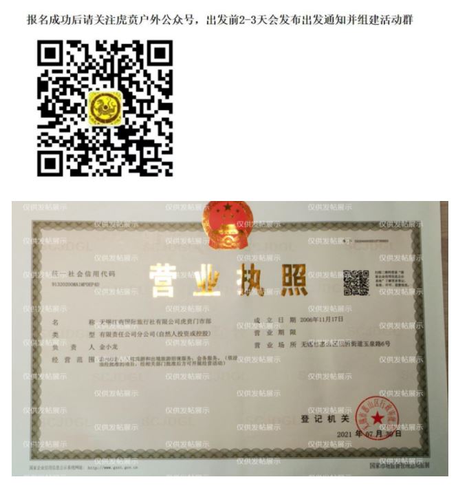 2.本活动由虎贲户外活动策划工作室勘测线路,采集信息,无锡江南国际旅行社虎贲门市部策划、发布、执行,许可证L-JS-CJ00053,监督电话83204044。