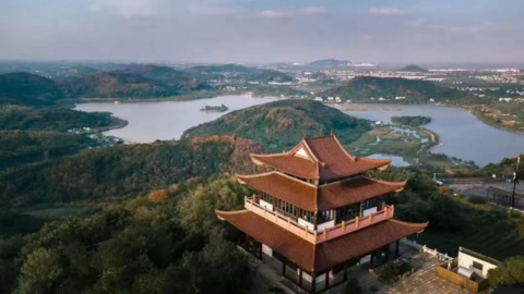 山脊线的尽头便是进入了南北湖景区的后山,沿着盘在山上的公路行走,目光所及便是湖光山色的景象。