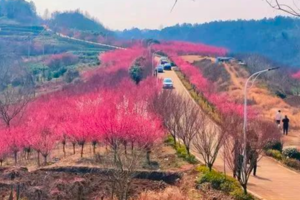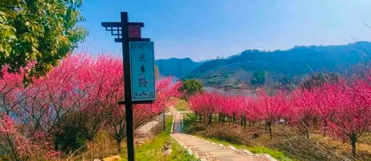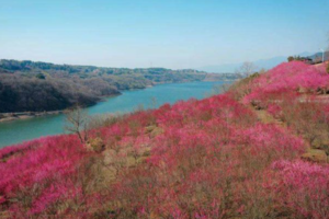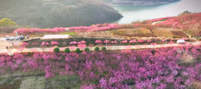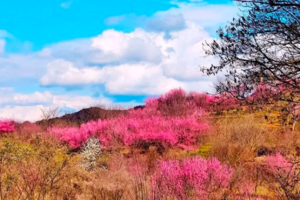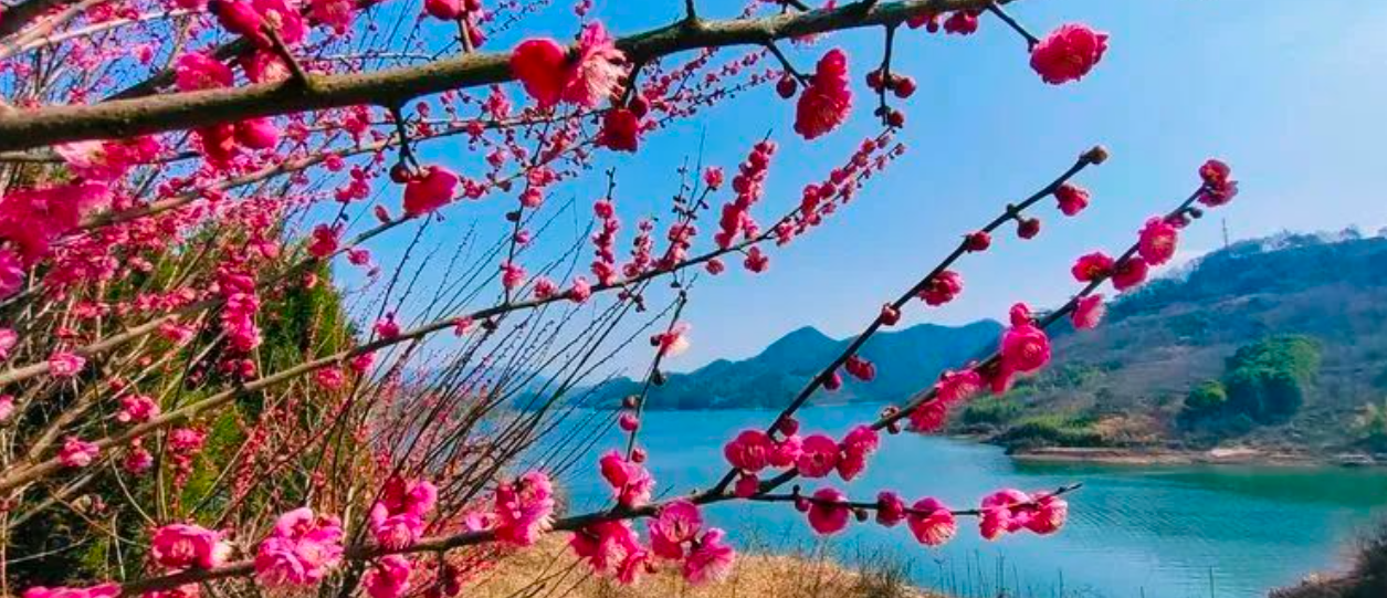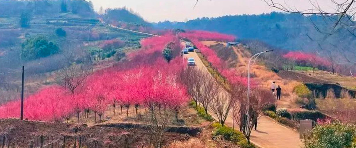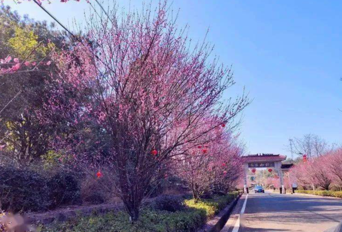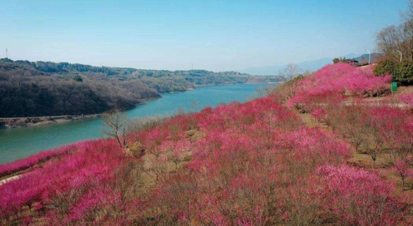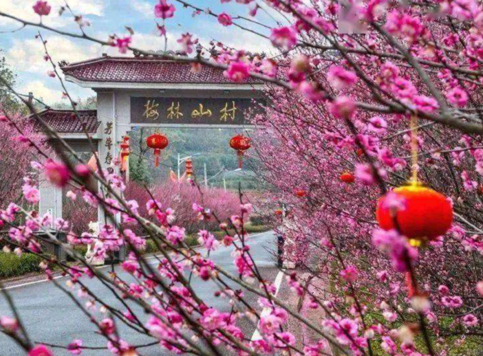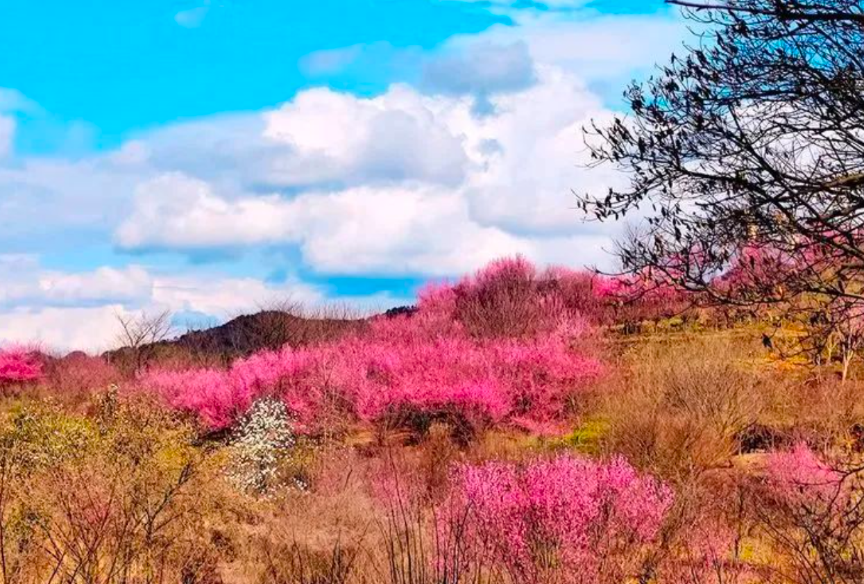 千亩梅林争相开放,形成像雪一样的海洋,整个山头如红旗覆盖,还有淡淡的花香袭来。