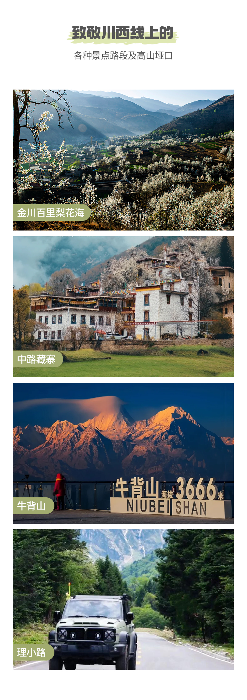 3、牛背山景区海拔3666米,不同的客人会有不同高反状态,建议您自备布洛芬/葡萄糖/感冒药/止泻药等药物;患有心脏病、高血压、心肌梗塞、心脑血管等疾病,做过心脏、大脑等手术,老年人、孕妇以及幼小群体,为了您的安全起见,慎重前往牛背山景区游玩。