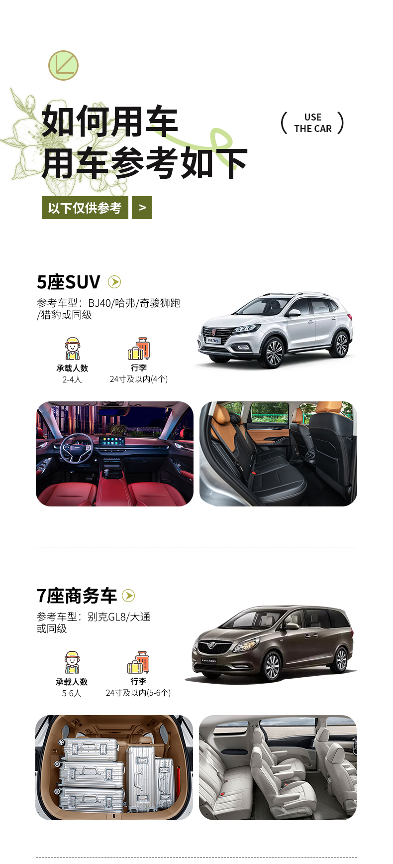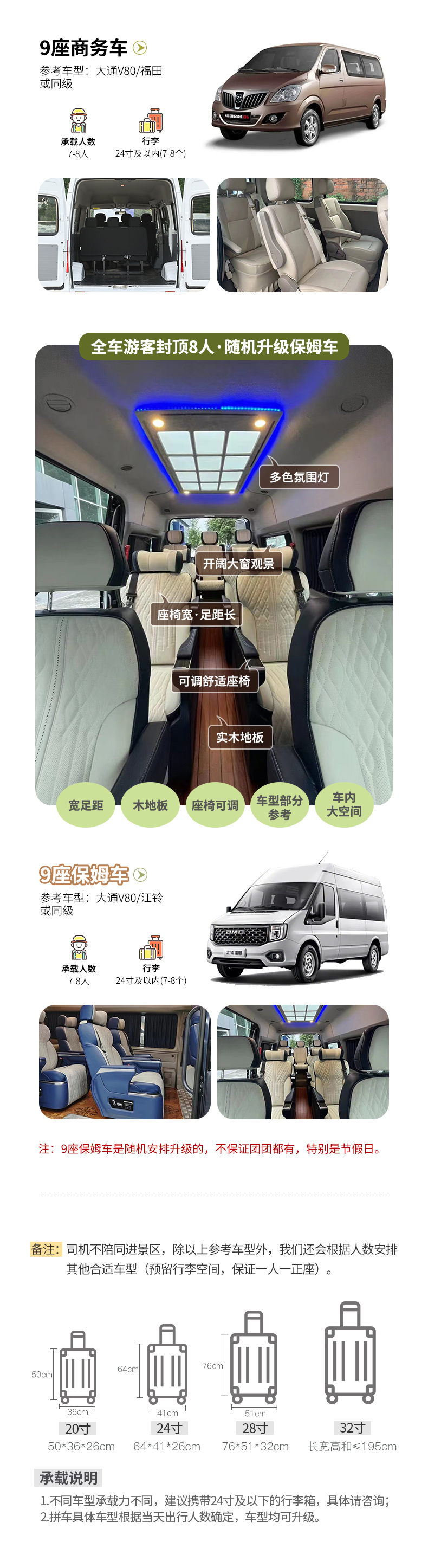 备注:车型承载力有限,携带行李为24寸或以下行李箱。