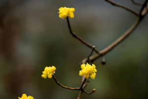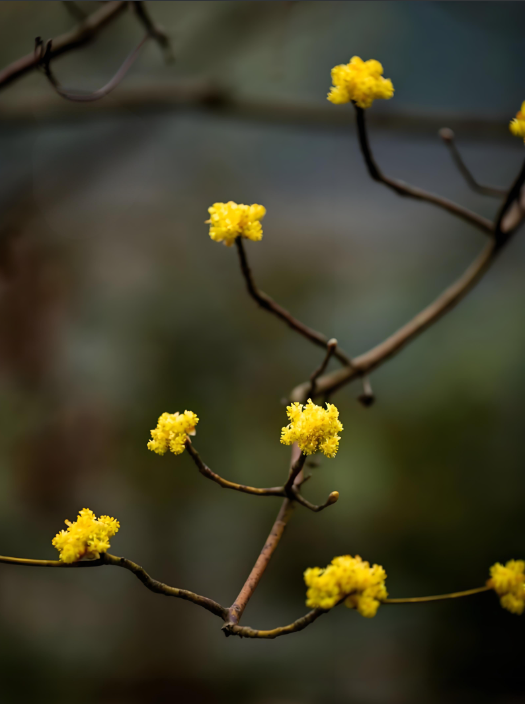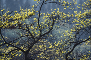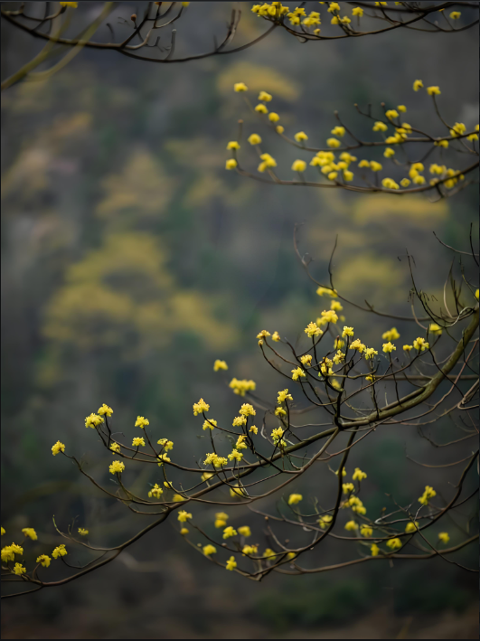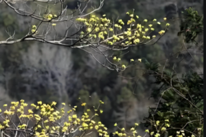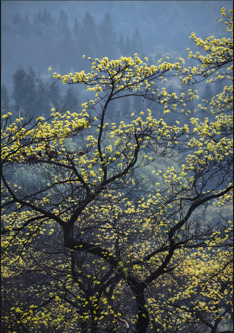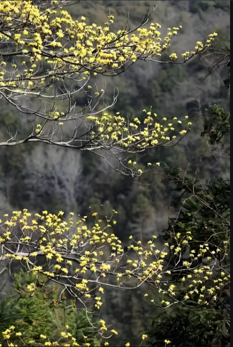 “坡上良木早接春,含苞夜雨满枝芬。金花清香风二里,志在高洁何须争。”檫树花在早春绽放,不畏严寒,开出的金色花朵飘香可以传播到很远的地方,被誉为早春第一花。